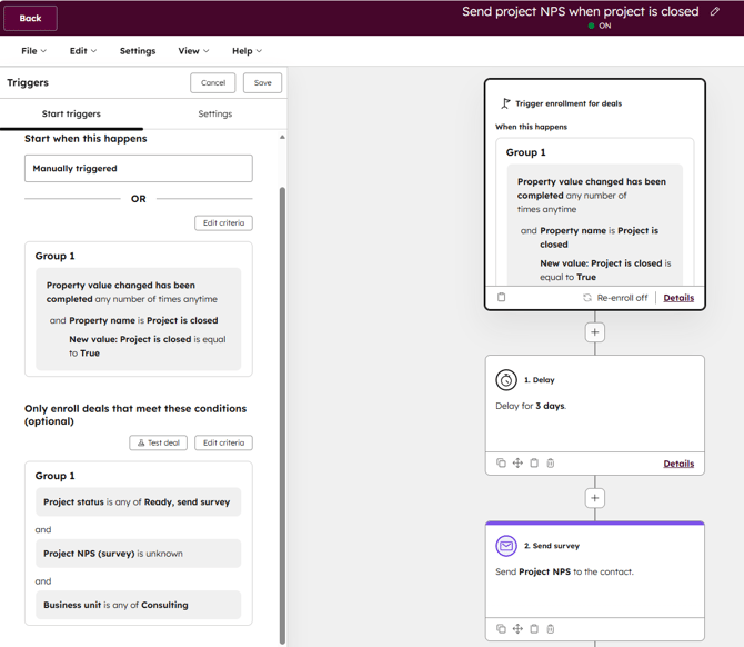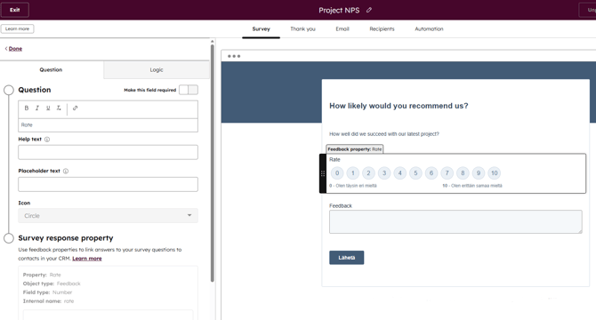 - Esimerkki Projekti NPS kyselyn luomisesta HubSpotissa