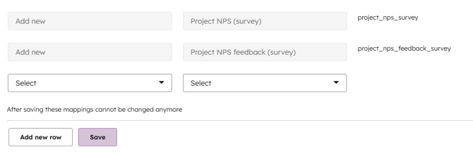 Rullaa sivun loppuun, valitse Severan kenttään Add new ja HubSpotin kenttään NPS. Klikkaa Add new row ja valitse Severan kenttään Add new ja HubSpotin kenttään NPS palaute ja tallenna.