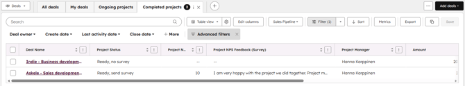 | Projekti NPS palaute | project_nps_feedback_survey | Property sync | Survey response | Kenttä, johon vapaa palaute tallentuu, esimerkissä Feedback | Most recently created |