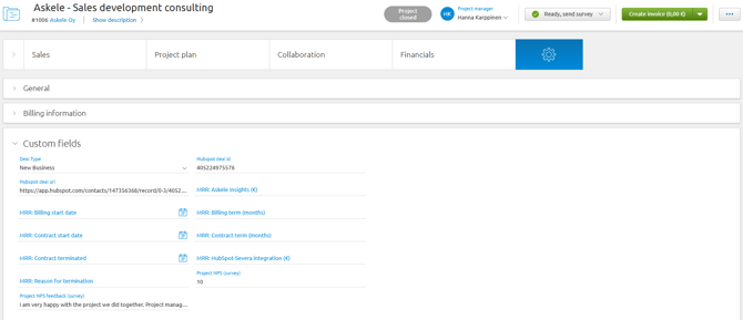 Mene HubSpotissa asetukset > Integraatiot > Yhdistetyt sovellukset > Severa.